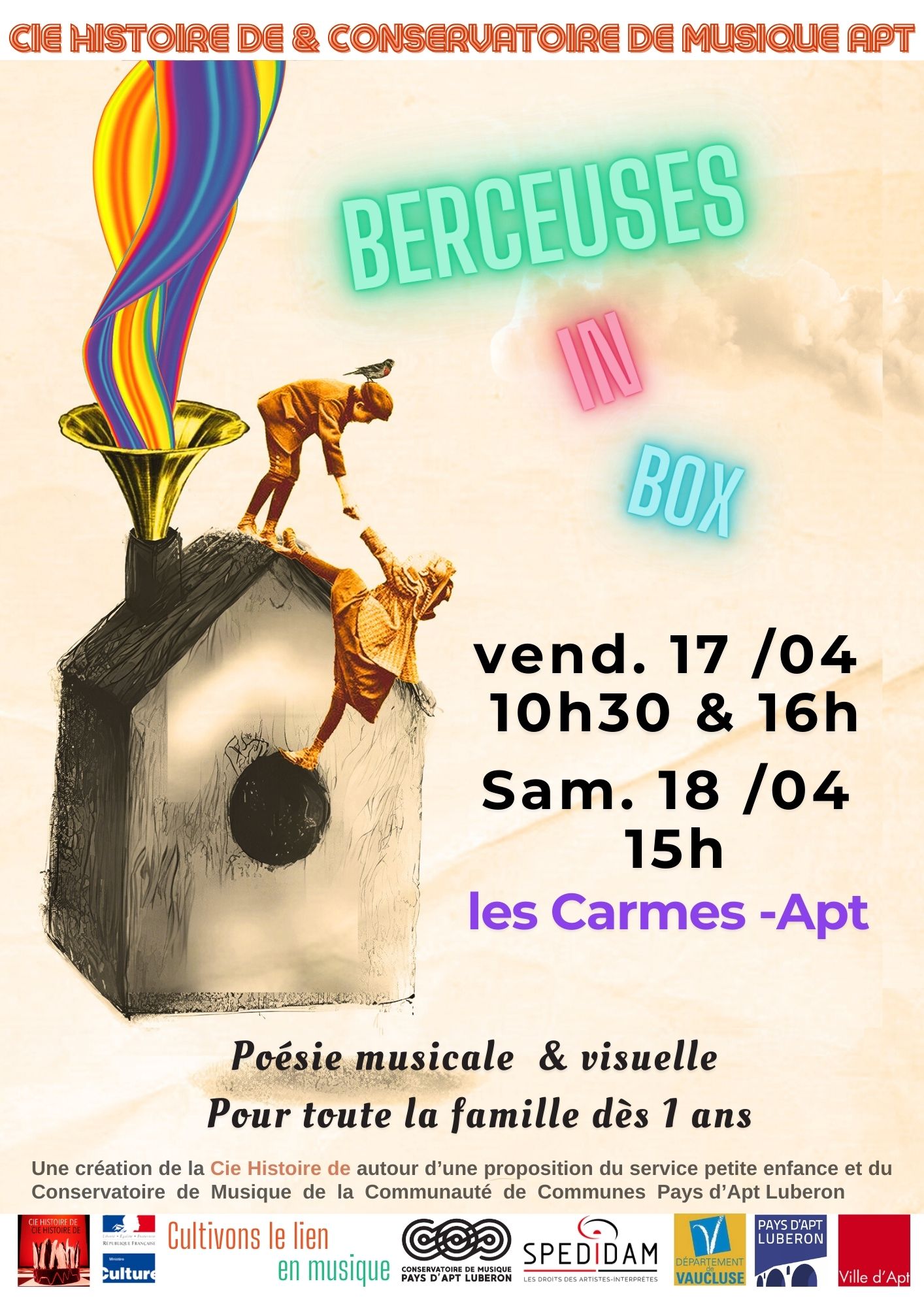 Pour les vacances d’Avril on vous propose 3 représentations du spectacle de la compagnie Histoire De Berceuses in Box dans la Salle des Carmes à Apt.